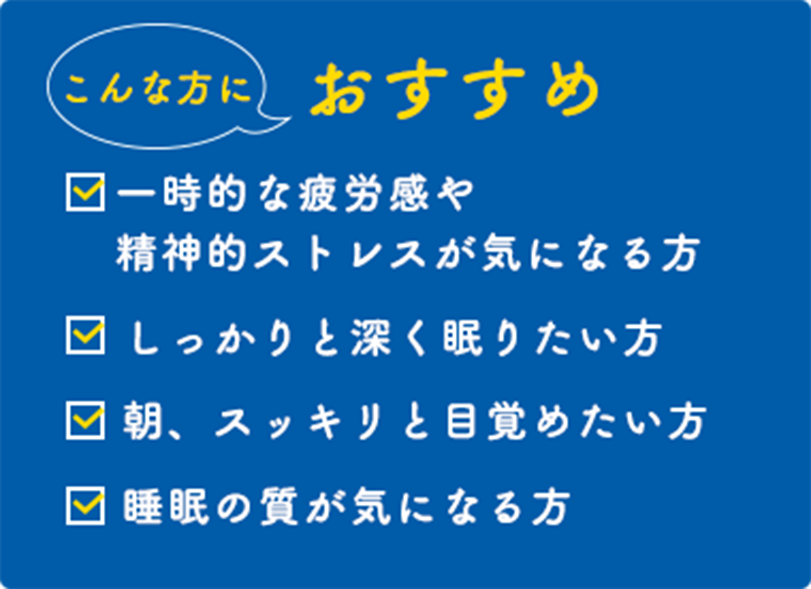 「眠りの深さ」と、「スッキリした目覚め」を促すことに役立つ機能をもち、睡眠の質の向上をサポートすること、さらに、仕事や勉強などによる一時的な疲労感や精神的ストレスを緩和する機能があることが報告されています。